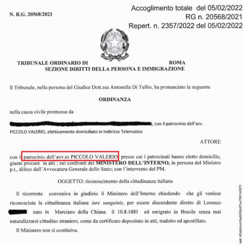 Em um dos milhares processos de cidadania via paterna em nosso escritório proposto pelo professor e advogado italiano Valério Piccolo em decisão do Tribunal de Justiça Italiano contra as filas do Consulado de Belo Horizonte que se manifesta: